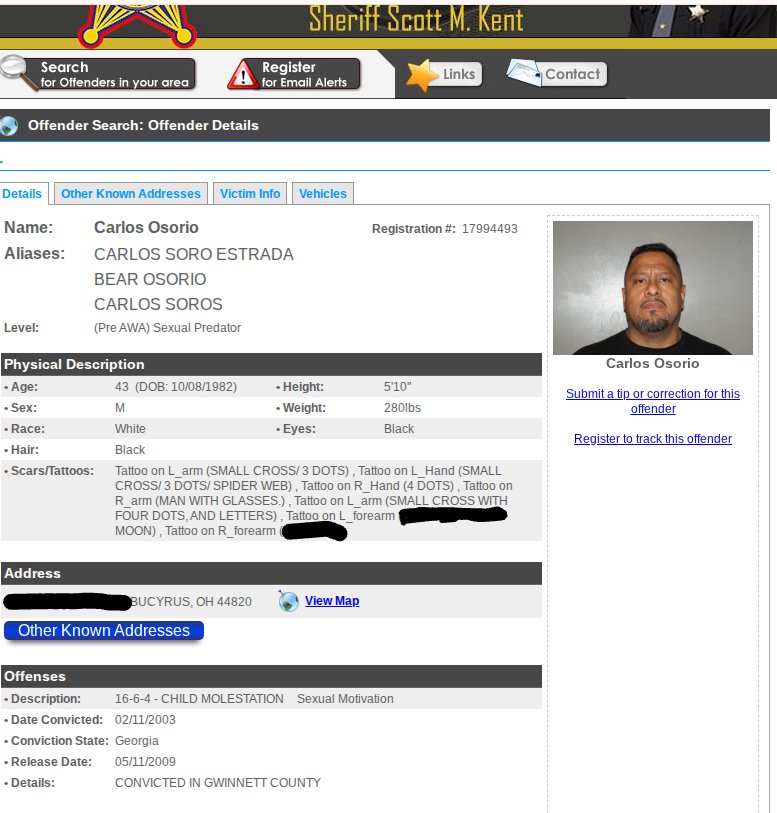 According to official court records from Gwinnett County, Georgia. Osorio was the defendant in State vs. Osorio (Case No. 01-B-02437-3), filed June 20, 2001. He was charged and found guilty of two counts of Child Molestation under Georgia Statute 16-6-4(a), his victim being a juvenile female. His exact date of relocation to Bucyrus is unknown but he is listed as a sex offender in Crawford County.