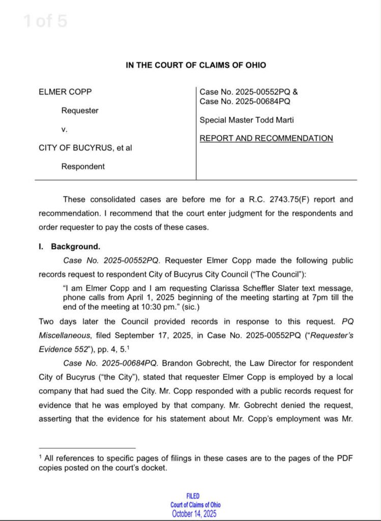 The Ohio Court of Claims has recommended a ruling against Elmer Copp of Galion, who filed two separate public-records complaints against the City of Bucyrus and Bucyrus City Council earlier this year.
