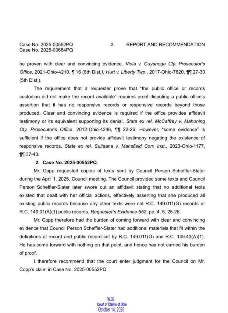The ruling, issued under consolidated case numbers 2025-00552PQ and 2025-00684PQ, is a recommendation to the Court of Claims judge. The decision will become final once the judge reviews and adopts the report, unless objections are filed within seven business days.