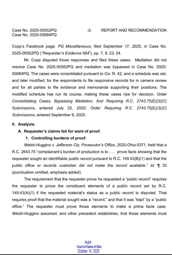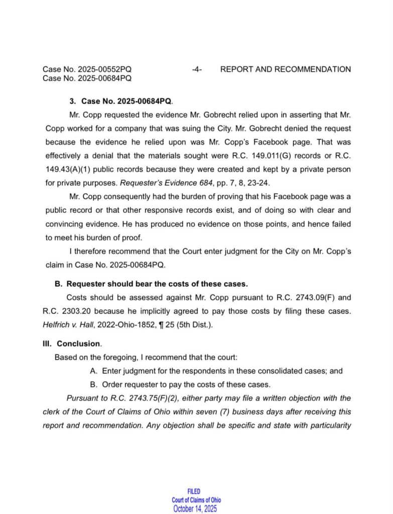 The second complaint stemmed from a statement by Bucyrus City Law Director Brandon Gobrecht, who said Copp was employed by a company that had sued the city. Copp filed a public-records request asking for proof of that claim. Gobrecht replied that his source was Copp’s own Facebook page. Because personal social media pages are not considered public records, the court determined that no violation occurred.