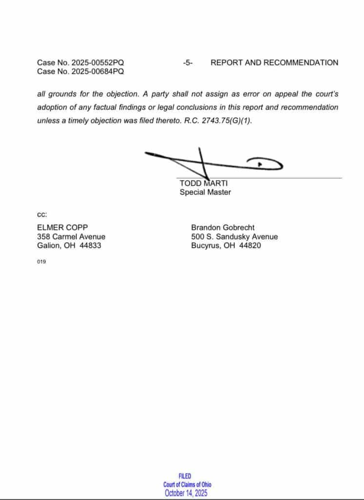 In both cases, Special Master Todd Marti concluded that Copp failed to meet his burden of proof and recommended that the court enter judgment in favor of the City of Bucyrus and City Council. Marti also advised that Copp be responsible for the costs of filing the cases.