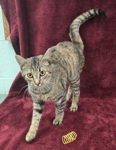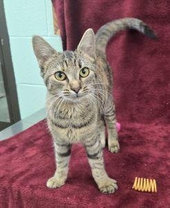 Sylvie is a female tabby who we estimate to be 8 months old. She was brought to us on 10/14/2025 as a stray and she was never reclaimed, so her history is a mystery to us. Sylvie is an affectionate, playful, and loving little girl. She actually wags her tail like a dog! She would make a great addition to any home!