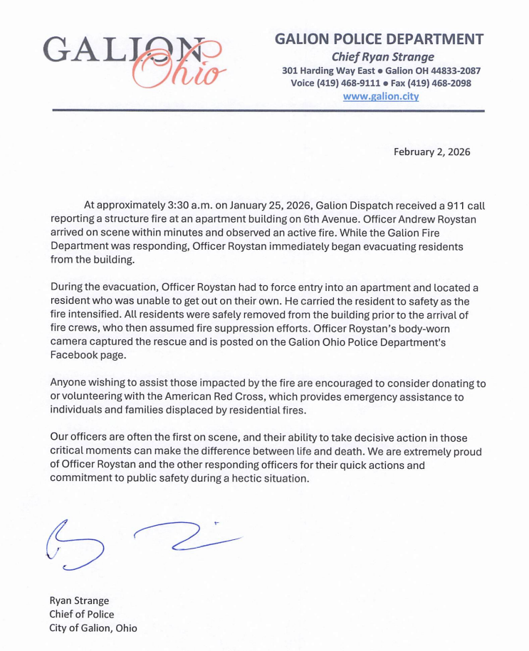 Galion Police Chief Ryan Strange praised the officer’s heroism. “Our officers are often the first on scene, and their ability to take decisive action in those critical moments can make the difference between life and death,” Strange said. “We are extremely proud of Officer Roystan and the other responding officers for their quick actions and commitment to public safety during a hectic situation.”