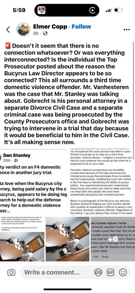 Fankhauser and his allies also attempt to tie Van Hesteren to an unrelated domestic violence case, claiming City Law Director Brandon Gobrecht had improperly assisted in the defense because Gobrecht also represented Van Hesteren in his divorce. This claim is not supported by fact; Van Hesteren was not the defendant in that case, and Gobrecht’s role was limited to addressing procedural questions.